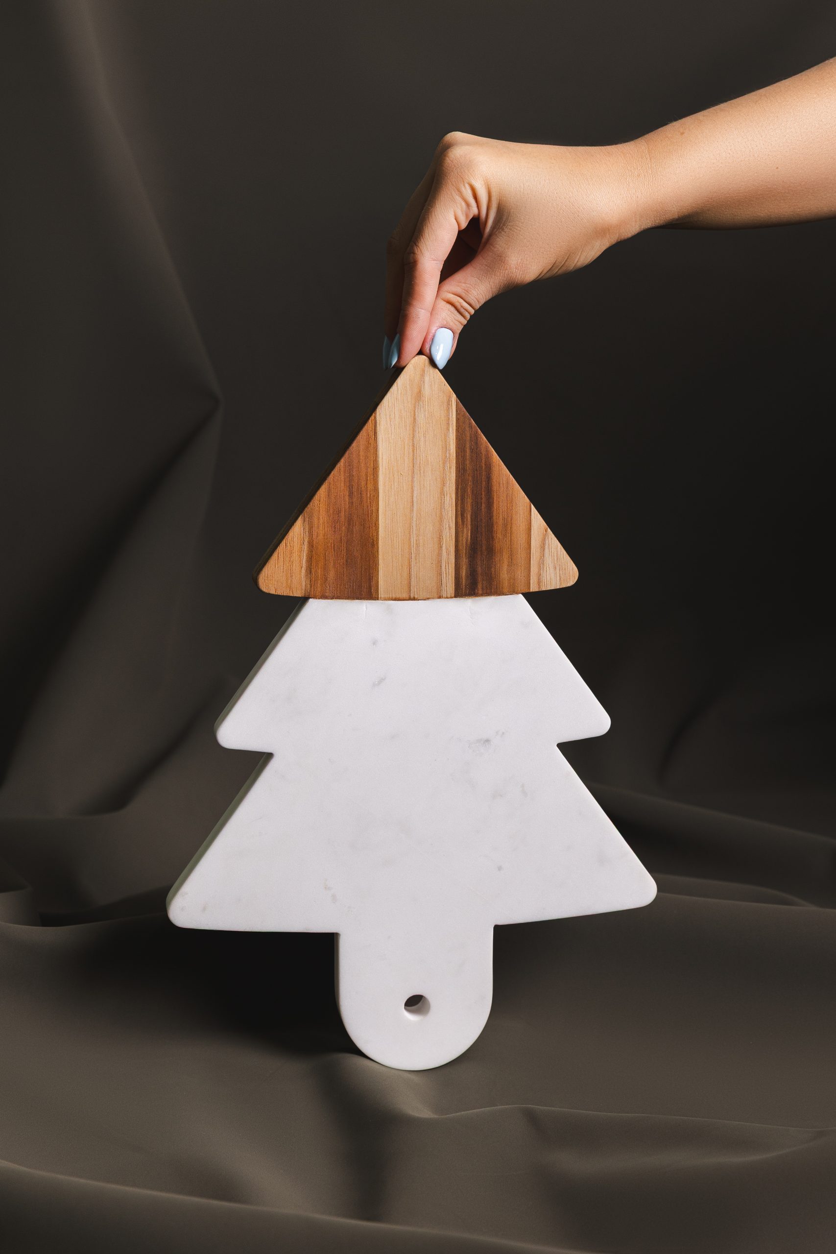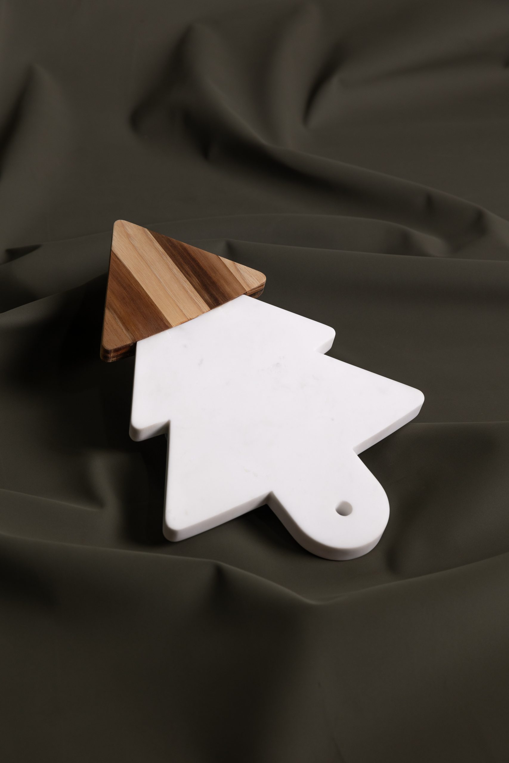 Albero Bianco é uma peça que une sofisticação e simbolismo. Esculpida em mármore Calacata e madeira teca, sua forma remete à pureza da neve e ao encanto das celebrações natalinas.