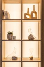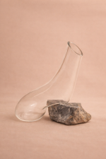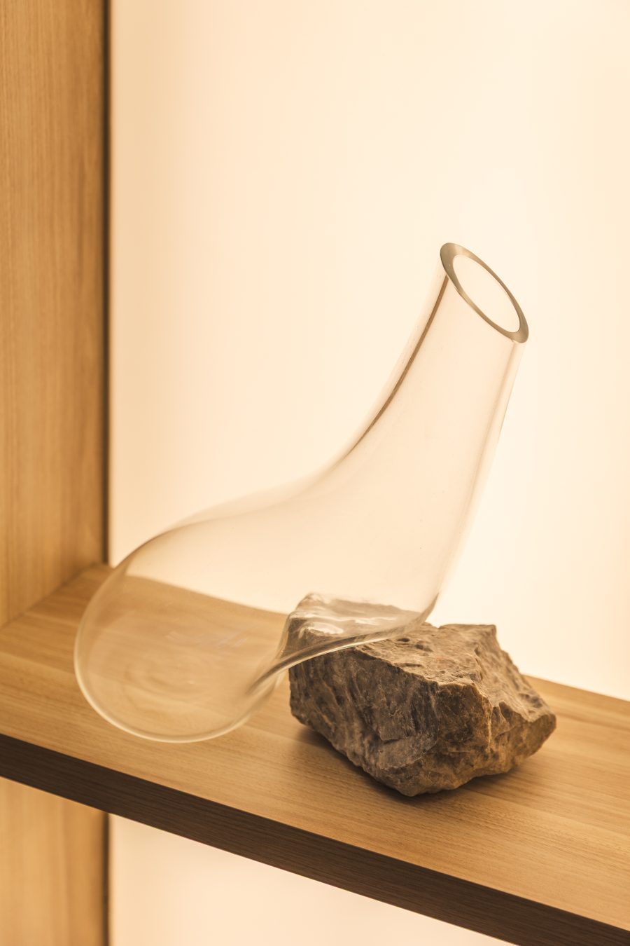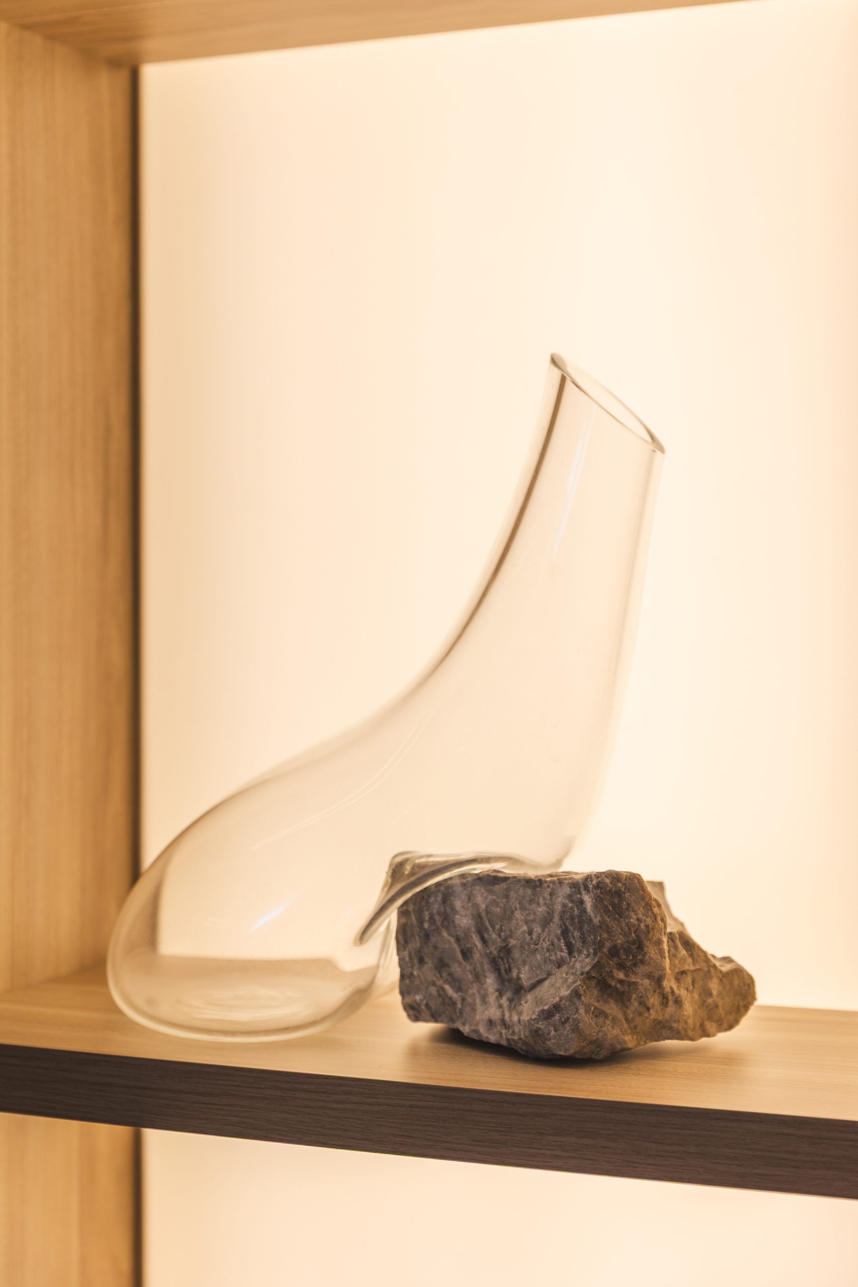 O vidro soprado em pedra, assume uma inclinação precisa, apoiando-se sobre a pedra natural como um ponto de equilíbrio entre leveza e solidez.